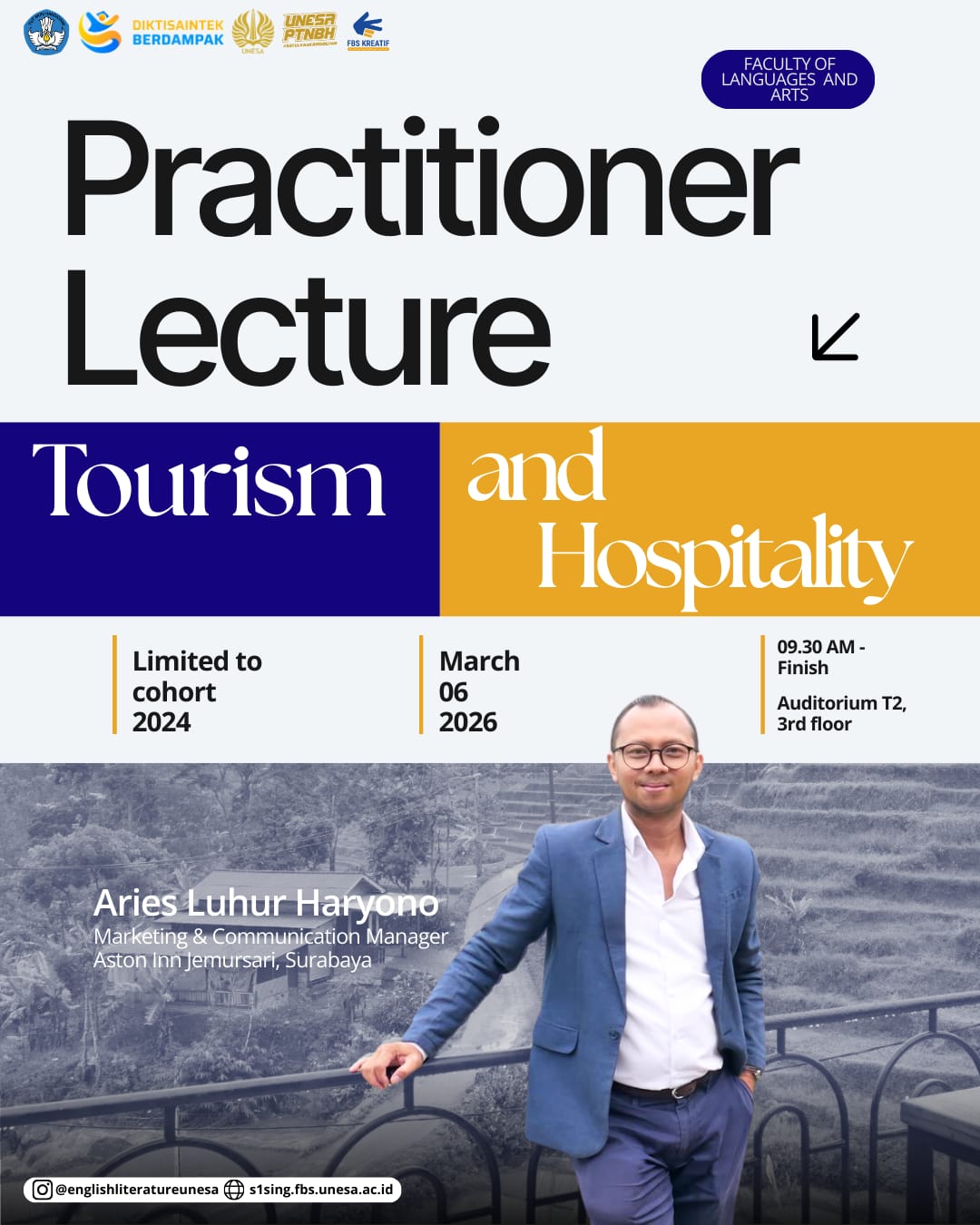 The lecture will feature Aries Luhur Haryono, Marketing & Communication Manager of Aston Inn Jemursari, Surabaya, as the invited practitioner speaker. Through his professional experience in the hospitality industry, he will share valuable perspectives on industry trends, communication strategies, and career opportunities in tourism and hospitality. This practitioner lecture is expected to broaden students’ understanding of how communication and language skills developed in the English Literature program can be applied in dynamic professional sectors such as hospitality and tourism.