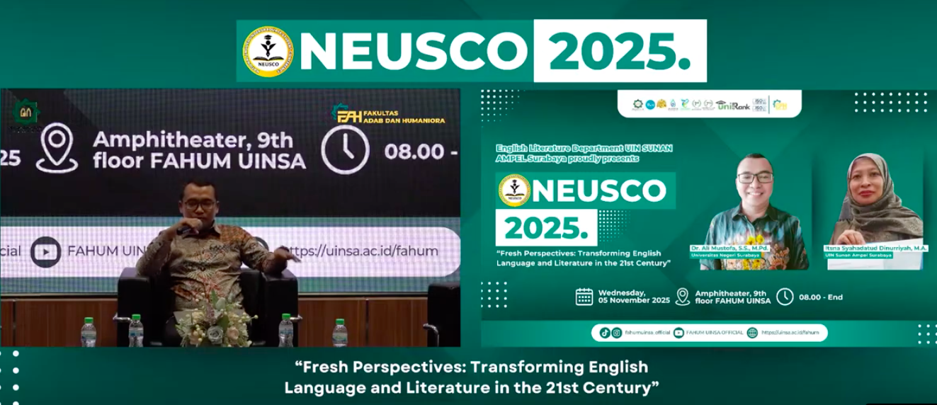 Dr. Ali Mustofa, S.S., M.Pd., lecturer from the English Literature Study Program, Universitas Negeri Surabaya, was invited as a keynote speaker at NEUSCO 2025, a national seminar organized by the English Literature Department of UIN Sunan Ampel Surabaya. The event, held on Wednesday, 5 November 2025, at the Amphitheater, 9th floor of the Faculty of Adab and Humanities (FAHUM) UINSA, carried the theme “Fresh Perspectives: Transforming English Language and Literature in the 21st Century.” Dr. Mustofa shared his insights on how English language and literature studies can adapt to the changing cultural and technological landscape, emphasizing innovation and interdisciplinary approaches in literary education.